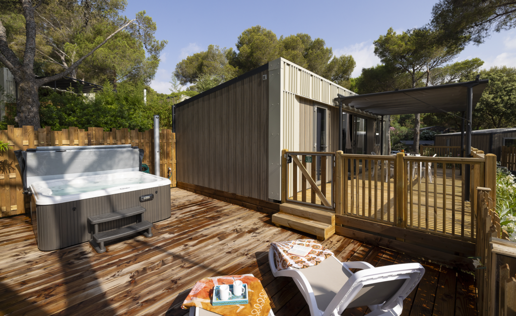 Nos mobil homes sont des joyaux de confort et de modernité. Pouvant accueillir entre 2 et 6 personnes en fonction du modèle, ils disposent tous de la climatisation, de chambres spacieuses et confortables, d’une salle d’eau accueillante avec toilettes séparés, d’une pièce de vie au design élégant et moderne, et d’une cuisine avec tout l’équipement nécessaire pour des vacances conviviales et chaleureuses en famille ou entre amis. Tous nos mobil homes bénéficient d’une grande terrasse en bois agrémentée d’une végétation soignée, garantissant l’intimité de tous. Que le mobil home soit au cœur de la pinède avec vue sur les collines, ou côté mer avec une vue mer partielle, toutes nos locations de vacances sont situées à quelques minutes à pied de la mer, permettant de laisser le véhicule stationné à côté de votre location de vacances et de partir en toute insouciance à la plage, cheveux au vent.